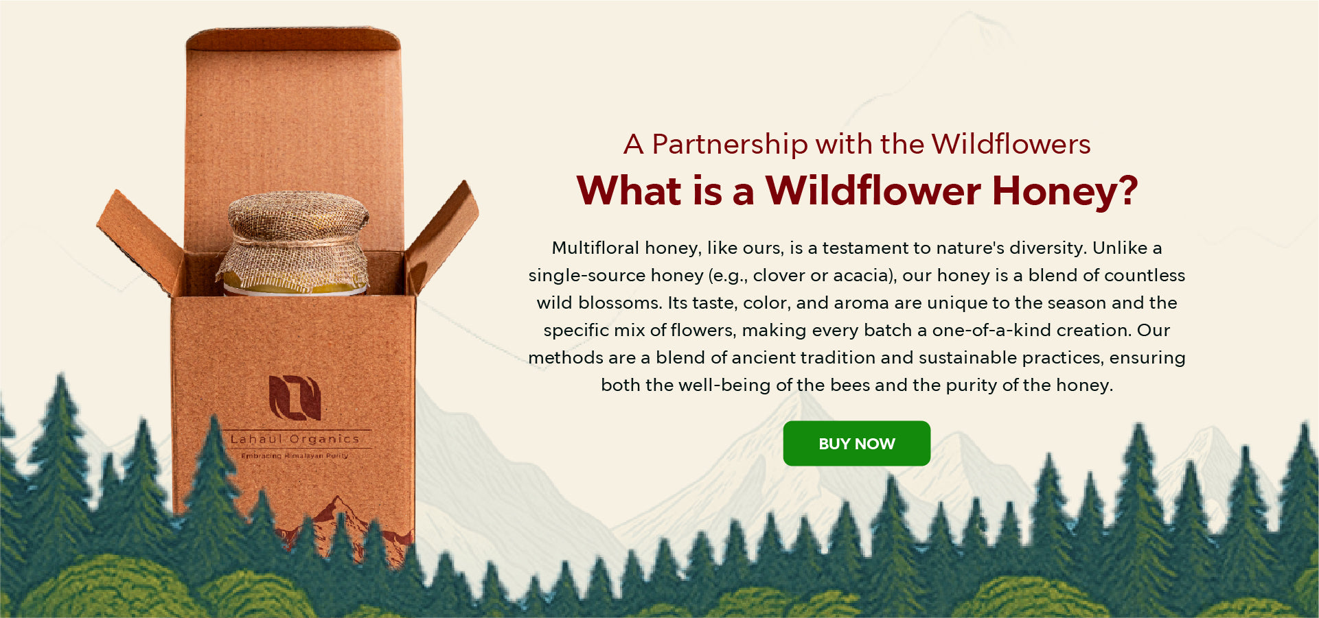 We begin with wild Himalayan bees, including Apis mellifera, the Italian bee. While native bees provide much of the honey, Apis mellifera plays a key role in pollination, helping farmers grow more food naturally. This harmony supports safe beekeeping, sustainable farming, and responsible honey harvesting. Our bees roam freely across alpine forests, collecting nectar from wildflowers, herbs, and trees - no sugar feeding, no shortcuts, no compromises.